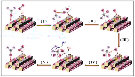 Based on the acquired data and earlier studies [43], a potential mechanism of the catalytic oxidation of HCHO on the MnOx/Sep-H catalyst is shown in Figure 11. Firstly, it involved the adsorption of HCHO and O2 onto the catalyst surface through the hydroxyl groups and d-orbital vacancies of Mn at step I, respectively. Secondly, the adsorbed O2 split to active oxygen radicals (O−) on Mn-vacancies, simultaneously converting Mn3+ to Mn4+ at step II. In this stage, oxygen radicals (O−) attacked the C=O bond of adsorbed HCHO, converting it to HCOOH (formate). Thirdly, HCOOH was further oxidized to CO2 and H2O by another oxygen radical (O−) at step III and step IV which has the ability to attack the C-O bond of formate species. Finally, the Mn4+ converts to Mn3+, and the occupied hydroxyl groups and d-orbital vacancies of Mn were also released at step V, providing exceptional stability for recycling. Therefore, with the exception of physisorption on sepiolite nanofibers and oxidation on MnOx active sites, the catalytic oxidation of HCHO on MnOx/Sep-H catalysts is therefore greatly enhanced by the synergistic impact of conversion between Mn3+ to Mn4+ and hydroxyl groups.