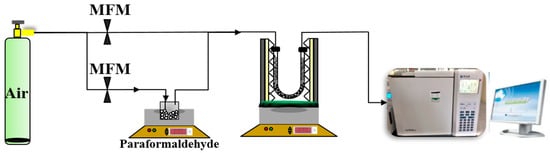 The catalytic activities of samples for HCHO oxidation were performed in a continuous-flow fixed-bed reactor [43]. 0.5 g catalysts (40–60 mesh) were loaded in a quartz reactor (6 mm). Gaseous HCHO was generated by purging paraformaldehyde with air. Another stream of air mixed with the gaseous HCHO. The HCHO concentration was controlled by adjusting the flow rate by a mass flow controller (GFC17A, Aalborg, New York, NY, USA.) and the temperature of incubator. The test route of the catalytic activities is shown in Scheme 1.