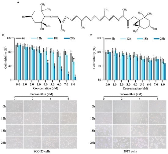 Effects of different fucoxanthin concentrations (0, 1, 2, 3, 4, 5, 6, 7, or 8 nM) for 6, 12, 18, or 24 h on SCC−25 tongue cancer and 293T embryonic kidney cell viability. (A) Chemical structure of fucoxanthin. (B) SCC−25 cell viability after fucoxanthin treatment relative to control group (no drug treatment). (C) 293T cell viability after fucoxanthin treatment relative to control group. Data are means ± standard deviations (SDs; n = 5). * p < 0.05, ** p < 0.01, compared with control.
