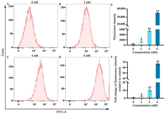 Effects of different fucoxanthin concentrations (0, 2, 4, or 6 nM) for 24 h on ROS production in SCC−25 cells. (A) Control group, (B) 2 nM fucoxanthin, (C) 4 nM fucoxanthin, (D) 6 nM fucoxanthin, and (E) quantitative analysis of fluorescence intensity in SCC−25 cells. (F) Fold change of fluorescence intensity (relative to control) in SCC−25 cells. * p < 0.05, ** p < 0.01, compared with control.