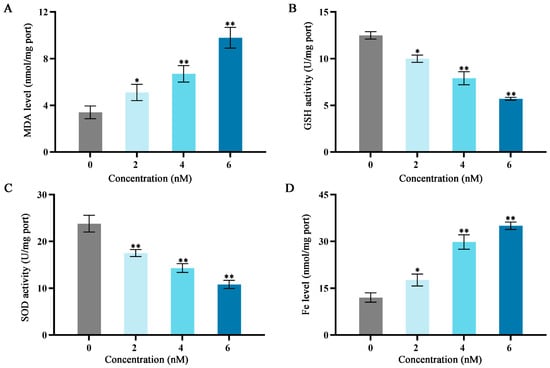 Effects of different fucoxanthin concentration (0, 2, 4, or 6 nM) for 24 h on antioxidant enzyme activities, Fe level, and MDA level in SCC−25 cells. (A) MDA level, (B) GSH activity, (C) SOD activity, and (D) Fe level. * p < 0.05, ** p < 0.01, compared with control.