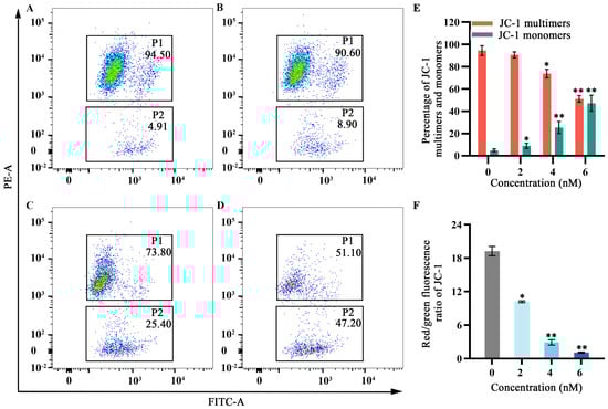 As cellular energy factories, mitochondria maintain high membrane potential; disruption of this potential can lead to apoptosis. Flow cytometry was used to observe the effects of fucoxanthin for 24 h on mitochondrial membrane potential in SCC−25 cells. In the control group, the JC−1 monomer proportion in SCC−25 cells was 4.91%. Treatment with 2 nM fucoxanthin increased the proportion to 8.90%; treatment with 4 nM and 6 nM further increased the proportion to 25.40% and 47.20%, respectively (Figure 5A–D). Low mitochondrial membrane potential prevented JC−1 accumulation in the mitochondrial matrix; this lack of accumulation resulted in green fluorescence. High mitochondrial membrane potential enabled JC−1 to accumulate in the mitochondrial matrix and form polymers, thereby producing red fluorescence. JC−1 red fluorescence intensity significantly decreased after fucoxanthin treatment, whereas green fluorescence intensity significantly increased (p < 0.05 and p < 0.01, respectively; Figure 5E,F), indicating that fucoxanthin substantially disrupted the mitochondrial membrane potential in SCC−25 cells. These results suggest that fucoxanthin can influence mitochondrial function in tongue cancer.