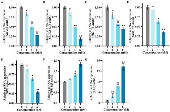 To explore the relationship between the inhibitory effects of fucoxanthin for 24 h on SCC−25 cells and the onset of ferroptosis, the mRNA expression levels of ferroptosis−related factors p53, SLC7A11, GPX4, Nrf2, Keap1, HO−1, and TFR1 were measured. The relative expression levels of Nrf2, HO−1, SLC7A11, Keap1, and GPX4 gradually decreased as the fucoxanthin concentration increased (Figure 6A–E). Treatment with at least 4 nM fucoxanthin significantly reduced the expression levels of Keap1 and GPX4 (p < 0.05). At fucoxanthin concentrations of ≥4 nM and ≥2 nM, the expression levels of TFR1 and p53 were significantly increased (p < 0.05 and p < 0.01, respectively).