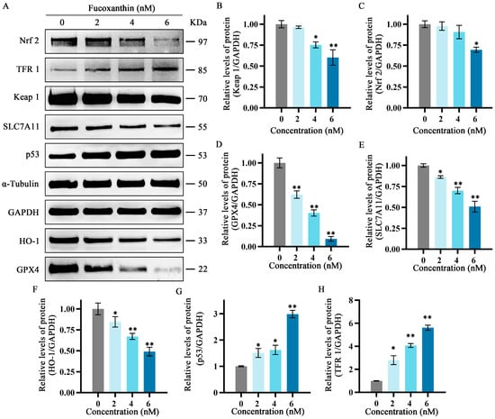Cells were seeded in 6−well plates (2 × 105 cells/well) and treated with 2, 4, or 6 nM fucoxanthin for 48 h. Cell lysis buffer containing protease and phosphatase inhibitors was added to cultures and cells were lysed on ice for 30 min, then centrifuged at 15,000× g for 15 min at 4 °C; the resulting supernatant was collected. After protein concentrations had been determined using the bicinchoninic acid (BCA) method, supernatants were mixed with 5× loading buffer for denaturation. Thirty micrograms of protein per sample were separated by 10% sodium dodecyl sulfate–polyacrylamide gel electrophoresis and electrotransferred to polyvinylidene fluoride (PVDF) membranes. The membranes were blocked with 5% skim milk powder for 1 h and incubated with primary antibodies (all 1:1000; see below) overnight at 4 °C. After membranes had been washed three times with Tris−buffered saline plus Tween (TBST), they were incubated with secondary antibodies (all 1:500) for 1 h at room temperature. After additional washes with TBST, enhanced chemiluminescence reagent was added and bands were detected using an imaging device (Tanon, Shanghai, China). Relative protein expression levels of SLC7A11, GPX4, TFR1, HO−1, Keap1, Nrf2, and p53 (all antibodies from ABclonal Technology, Wuhan, China) were calculated using ImageJ 1.53 software, with glyceraldehyde−3−phosphate dehydrogenase (GAPDH) as the internal control.