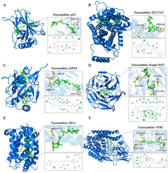 Molecular docking of fucoxanthin with target proteins. Optimal conformations of fucoxanthin binding to p53 (A), SLC7A11 (B), GPX4 (C), Keap1–Nrf2 (D), HO−1 (E), and TFR1 (F), with key residues around each binding site. Hydrogen bonds are presented as yellow dashed lines with distances in angstroms (Å). Two−dimensional schematic diagrams depict interactions of fucoxanthin with active sites of target proteins. Dotted lines represent hydrogen bonds (dark green), π–σ T−shaped forces (dark purple), and hydrophobic interactions (purple) with surrounding amino acid residues. Acidic residues in light green denote van der Waals forces.