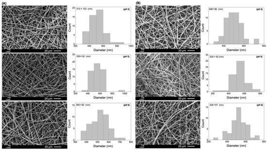 SEM images of E18(EtOH80) fibers (sample corresponding to the uppercase letter “C” in Table 1) after 1 h (A) and 5 h (B) of immersion in aqueous HNO3 solutions at pH 3, 5, and 6.