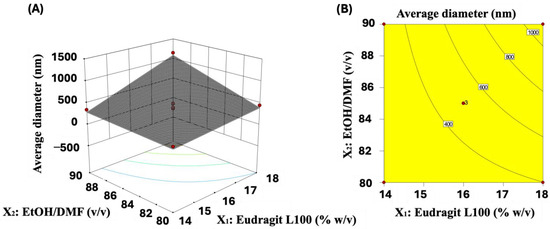 The influence of the variables on the average fiber diameter is depicted in a two-dimensional graph (Figure S1, Supplementary Material). Both variables X1 and X2 show a similar impact on the response. Decreasing the copolymer concentration and decreasing the amount of EtOH in the Eudragit L100 solution contribute to a reduction in fiber diameter. These trends are observed in Figure S1, where mean fiber diameters ranging from 259 to 1152 nm are observed (Table 2). Assay 1 (X1 = 14% w/v and X2 = 80/20 v/v) yields the thinnest fibers with a diameter of 259 nm, while assay 3 (X1 = 18% w/v and X2 = 90/10 v/v) produces the largest fibers with a mean diameter of 1152 nm (Table 2). These findings align with the previous discussions, emphasizing that decreasing Eudragit L100 concentration and adjusting the EtOH amount are desirable to obtain thinner fibers.