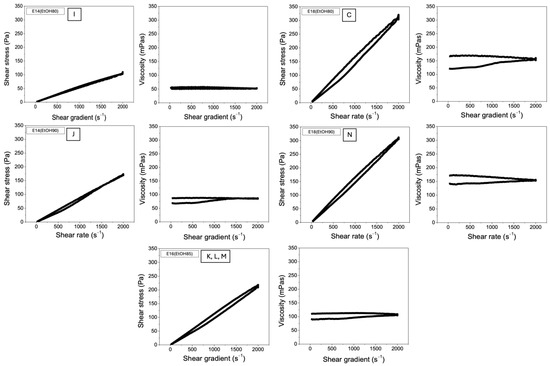 Shear stress and viscosity curves plotted against the shear rate for the polymer solutions used in the optimization study (Table 2). The experimental conditions evaluated include E14(EtOH80), E14(EtOH90), E16(EtOH85), E18(EtOH80), and E18(EtOH90). The uppercase letters (“C”, “I”, “J”, “K”, “L”, “M”, and “N”) following the acronyms in each figure correspond to the samples listed in Table 4.