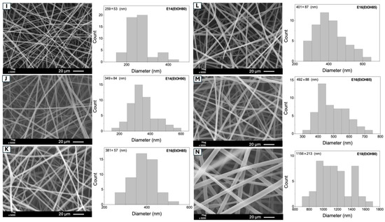 SEM images of the fibers (E14(EtOH80), E14(EtOH90), E16(EtOH85), and E18(EtOH90)) obtained from the experimental conditions investigated in the factorial design (Table 2), excluding sample E18(EtOH80) (label C) previously shown in Figure 1. The uppercase letters “I”, “J”, “K”, “L”, “M”, and “N” in the SEM images correspond to the samples listed in the second column of Table 2.