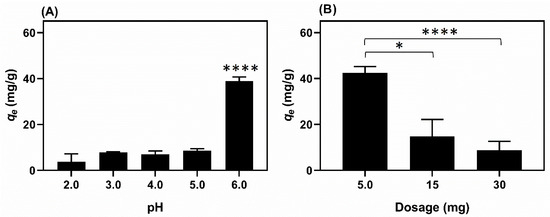 The effect of pH on the adsorption assays is shown in (A). The experimental conditions for this investigation included the use of 5 mg of adsorbent (E14(EtOH80), labeled as sample “I” in Table 2), 40 mL of Cu(II) solution (copper(II) sulfate) at 8.0 mg/L, and shaking at 100 rpm (25 °C) for 24 h (A). An aqueous HNO3 solution (0.01 M) was used to adjust the pH of the solutions in the range of 2.0 to 6.0. The effect of fiber dosage (B) on the adsorption of Cu(II) ions in aqueous solutions. The experimental conditions for dosage effect in the Cu(II) adsorption involved the use of 40 mL of Cu(II) solution (copper(II) sulfate) at 8.0 mg/L (pH 6.0) and shaking at 100 rpm (25 °C) (B). The terms * and **** indicate results with statistical differences with p ≤ 0.05 and p ≤ 0.0001, respectively.