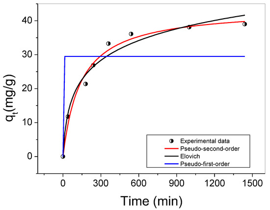 Kinetic parameters of the pseudo-first-order, pseudo-second-order, and Elovich models obtained from the adjustments shown in Figure 7.