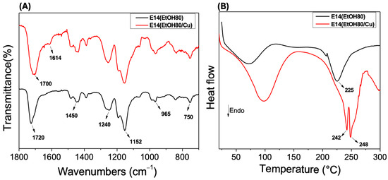 The DSC curves of the E14(EtOH80) and E14(EtOH80/Cu) fibers are presented in Figure 8B. In the E14(EtOH80) DSC curve, the endothermic peak associated with the melting temperature is observed at 225 °C. In contrast, the E14(EtOH80/Cu) DSC profile shows endothermic peaks at 242 and 248 °C. A comparison of the DSC curves reveals distinct profiles for the endothermic peaks, indicating ordered regions in the E14(EtOH80/Cu fiber. Adsorbed Cu(II) ions electrostatically interact with the carboxylate groups of Eudragit L100 within the fibers, leading to Cu(II) adsorption. The intensity of the endothermic peak corresponding to the melting temperature is significantly lower in the E14(EtOH80) DSC profile compared to the intensity of the endothermic peaks in the E14(EtOH80/Cu) DSC curve. The presence of Cu(II) ions results in higher thermal stability of the fibers due to the ordered regions in the complexed fiber, as supported by the endothermic peaks at higher temperatures in the E14(EtOH80/Cu) DSC curve [45] (Figure 8B).