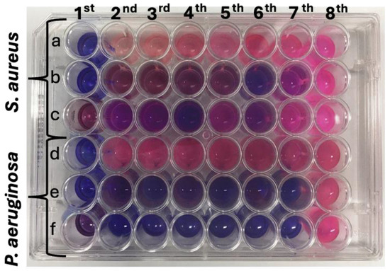 Figure 9 shows a digital image of a 48-well plate containing bacterial suspensions, where E14(EtOH80), E14(EtOH80/Cu), and copper(II) sulfate solutions were added. The first three rows (“a”, “b”, and “c”) correspond to wells seeded with S. aureus, while the last three rows (“d”, “e”, and “f”) represent wells seeded with P. aeruginosa. The first column represents the positive control, which contains samples without bacteria. The eighth column represents the negative control, consisting of wells containing only microbial culture without samples. Rows “a” and “d” correspond to the assays conducted with E14(ETOH80), while rows “b” and “e” represent the 48-well plates seeded with E14(ETOH80/Cu), and rows “c” and “f” were seeded with copper(II) sulfate (Figure 9). The digital image was captured after adding resazurin, a colorimetric indicator of cell viability. Blue wells indicate low microbial activity, while pink ones indicate high cell viability (Figure 9).