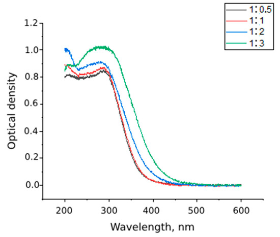 Ultraviolet–visible spectroscopy was performed on a spectrophotometer SF-2000 (OKB Spektr, Saint Petersburg, Russia), working on a single-beam scheme. Imaging was performed in the wavelength range from 190 to 800 nm with a step of 0.1 nm, and the optical slit width was 0.2 nm. Imaging in the range from 190 to 394.9 nm was performed using a deuterium lamp, and from 395 to 800 nm using a halogen lamp. The exposure time was 50 msec. Each spectrum was imaged 10 times with subsequent averaging of the results.