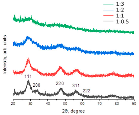 According to the data of X-ray phase analysis, the synthesized variants of nanocomposites are CeO2 nanoparticles with a size of 0.5–4 nm (Figure 2). Moreover, the more dextran in the composition of the composite, the less clear the diffraction peaks characteristic of cerium dioxide. This is due to the fact that with increasing concentration of polysaccharide in the composite, the thickness of the dextran coating of nanoceria increases.