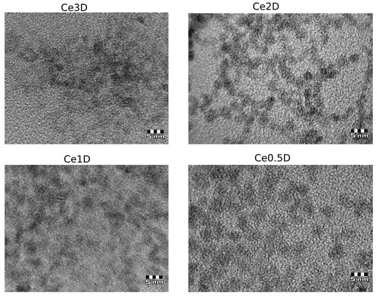 Transmission electron microscopy results confirmed that the nanoparticle sizes were less than 5 nm (Figure 4), while increasing the dextran content led to a decrease in particle size to 0.5–2.5 nm in Ce2D and Ce3D, which agrees well with the XRD data.