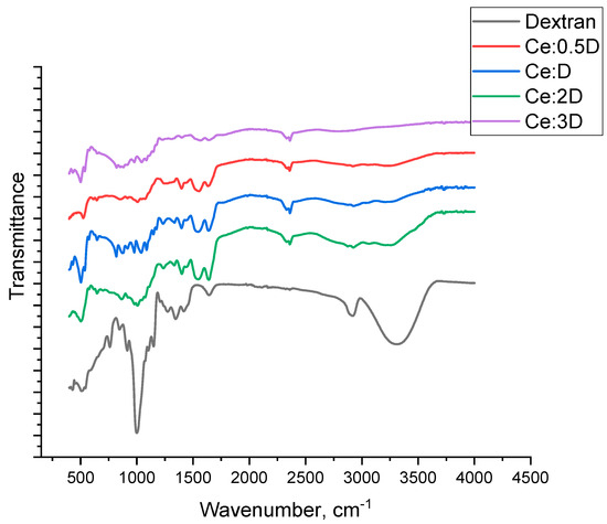 Infrared spectra for cerium dioxide composites stabilized with dextran in different ratios (0.5 to 3).