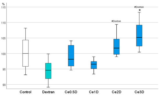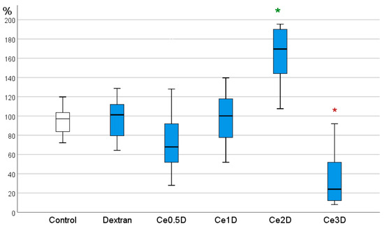 The most frequent dead cells were determined in the Ce0.5D group (16.7% of cases registered 2–29% dead cells). Single cases of dead cells were reported in the dextran and Ce1D groups (dextran: 25% of cases (3 out of 12 cells) reported 2% to 5% dead cells; Ce1D: 16.7% of cases (2 out of 12 cells) reported 5% dead cells). Although this is not an indication of cytotoxicity (acceptable values), it is reasonable to select Ce2D and Ce3D for future drug development.