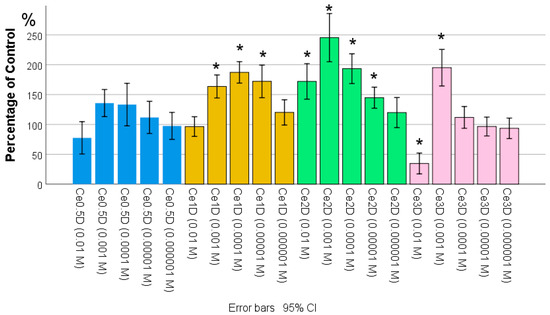 Effect of nanocomposites based on cerium oxide polysaccharide dextran polysaccharide in a wide concentration range of 10−2 M–10−6 M on the proliferative activity of human fibroblasts by direct cell counting. Mean percentages from control are presented (ANOVA OD:F = 19.703; df 20, p < 0.001; *—difference significant from control at *—p < 0.05 Dunnett t-tests).