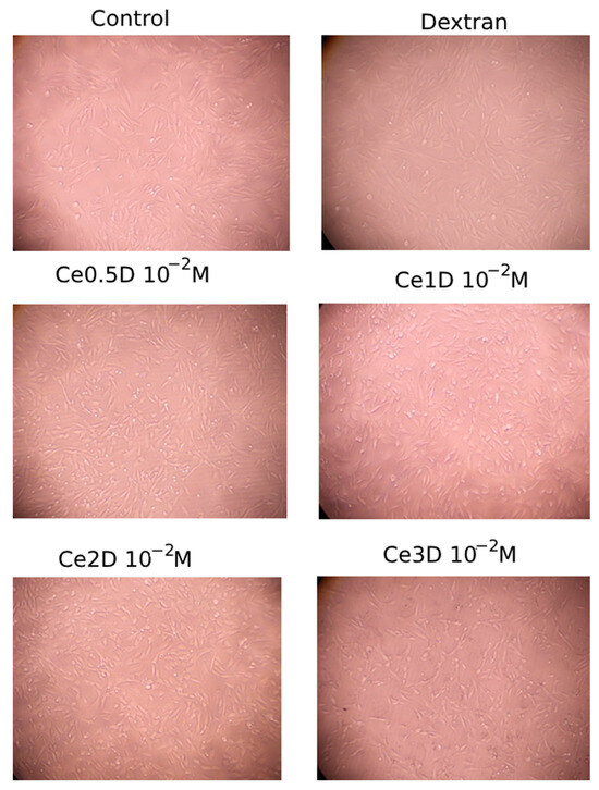 In the course of analyzing the results of the MTT test, it was found that the metabolic activity of fibroblasts at 72 h of co-cultivation increased with increasing dextran content in the nano-composites studied at a concentration of 10−2 M. The highest level, significantly different from both the control group and the comparison group of dextran, was recorded in the Ce3D sols. Moreover, the Ce2D and Ce3D groups did not differ from each other, and in most cases, fibroblast metabolism was higher than in the control (Figure 7). No statistically significant differences were found between Ce0.5D and Ce1D groups. These groups also did not differ from the control and dextran groups, although they were slightly superior to dextran in terms of effect.