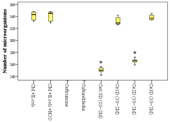 Number of E. coli microbial bodies (×105/g) in control groups and when co-cultured with sols of dextran-coated nanoceria in different cerium–dextran ratios, after 24 h of incubation (*—significant difference from control (culture media and E. coli) at p < 0.01; ANOVA test including posterior Dunnet tests).