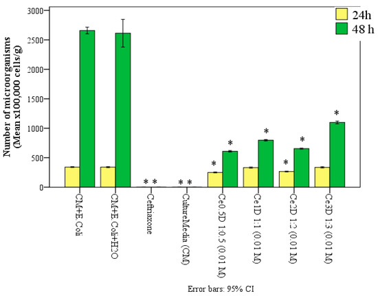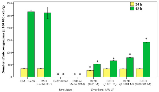Number of E. coli microbial cells (×105/g medium) in control groups and when co-cultured with 10 vol.% Ce2D nanocomposite sols at different concentrations after 24 h and 48 h (*—significant difference from control (culture media and E. coli) at p < 0.01; ANOVA including Dunnett’s posterior tests).