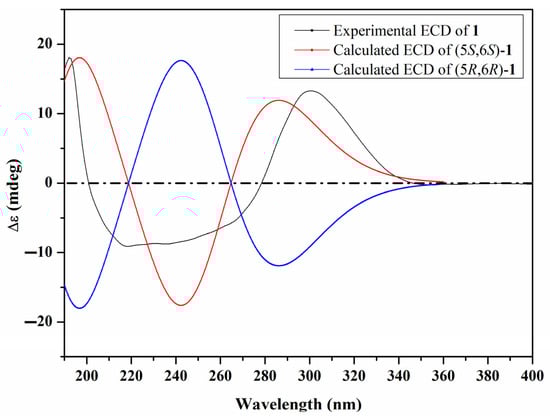A literature search of 1 revealed its common structural features of strobiloscyphones [10], pestallic acids [11], dentipellin [4], and the recently reported lachnoic acids [12], where they shared the presence of a 2-cyclohexenone moiety in their structures. A careful interpretation of the obtained 1D and 2D NMR spectral data of 1 (Table 1, Figure 2) suggested the structure depicted in Figure 1, with a 1,1-dimethyl-2-propenyl functionality being attached at C-6. The relative configuration of 1 at C-5 and C-6 was determined by its ROESY spectrum, which revealed an ROE correlation between two exchangeable broad singlet proton signals at δH 3.44 and 2.37 assigned to 5-OH and 6-OH, respectively. This thus indicated their cofacial orientation, while the 1,1-dimethyl-2-propenyl moiety is projected toward the opposite face of the molecule. The ROESY spectrum of 1 (Figure 2 and Figure S8) also revealed key ROE correlations between the two diastereotopic methyl groups, H3-11 and H3-12, and H-4β, H-5, H-8, and H2-9, confirming the depicted structure of 1. Accordingly, the ROESY spectrum suggested the relative configurations at C-5 and C-6 were either (5S*,6S*) or (5R*,6R*). To determine the absolute configuration of 1, its ECD spectrum was acquired and, hence, compared to the calculated TDDFT-ECD spectra of (5S,6S) and (5R,6R) enantiomers. The obtained results (Figure 3) revealed a coherence between both the experimental and calculated ECD spectra of (5S,6S) configuration. Based on the obtained results, compound 1 was identified as a previously undescribed natural product named dentifragilone A.