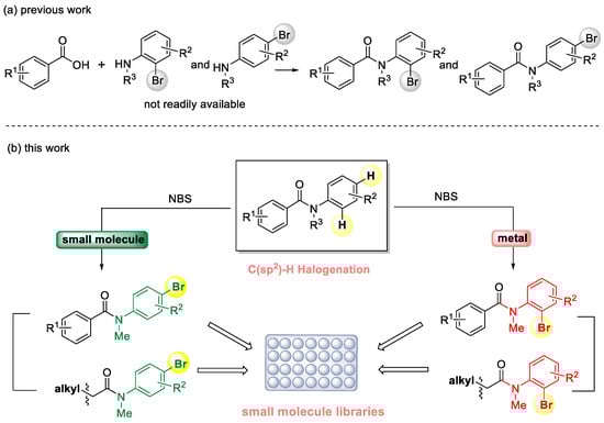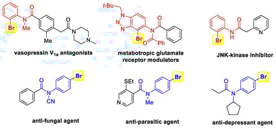 Brominated benzanilides are an important class of structures essential for the function of almost all modern pharmaceuticals and agrochemicals [1,2,3,4]. Because of the steric hindrance of -Br, the bromo group located in the ortho or para position of the benzanilide molecule produces different biological activities [5,6]. Indeed, in anti-hypertensive compounds and anti-cancer agents, the bromo group is in the ortho position, while it is in the para position in anti-depressant drugs or anti-microbials agents (Figure 1). Therefore, the acquisition and rapid screening of small molecule libraries containing diverse brominated benzanilides is an essential aspect of hit compounds discovery. More importantly, based on the diversity-oriented synthesis (DOS) strategy, C-C or C-N bond formation via cross coupling starting from brominated benzanilides will efficiently generate structurally diverse compound libraries, such as benzidine, phenylenediamine, etc. [7,8,9,10,11,12]. To date, various important small molecule modulators have been identified for “undruggable” targets from unbiased phenotypic screening of DOS-derived compound libraries [13,14,15,16]. However, the classic approach to the generation of brominated benzanilides involves a two-step process: bromination of aniline followed by the benzoylation of the resulting brominated product, which suffers from limitations such as poor selectivity, low yields, complex purification method, etc. (Scheme 1a) [17,18,19].