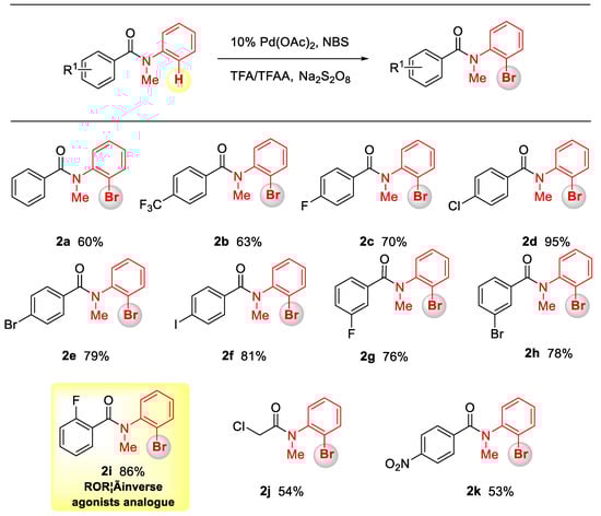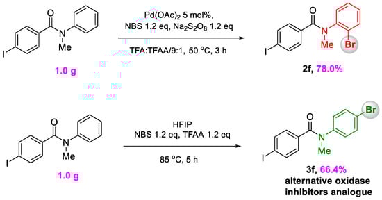 Since brominated iodobenzanilides are widely utilized in bioactive agents [42,43,44,45], to prove both the synthetic utility effectiveness of this method for large-scale synthesis, we prepared 2f and 3f on a gram scale under the optimized reaction conditions with only a 5 mol% catalyst (Scheme 2). Compared with conventional approaches requiring brominated alkylanilines, which are generally expensive, this method with operational simplicity is advantageous for rapid access to various kinds of ortho and para brominated benzanilides. We further showed the feasibility of this new reaction by performing the synthesis of biologically important molecules (Figure 2 and Figure 3). With Pd(II) as a catalyst, 2-fluoro-N-methyl-N-phenylbenzamide was readily converted to brominated compound 2i as an RORγ inverse agonists analogue in a good yield [46]. RORγ is mainly expressed in immune cells, promoting the differentiation of Th17 cells and producing the key factor IL-17. RORγ plays the corresponding biological functions in a variety of important inflammatory pathways. Recent studies have found that an RORγ inverse agonist is a new therapy for the treatment of castration-resistant prostate cancer (CRPC). This type of brominated compounds can be conveniently synthesized by our method with excellent chemoselectivity, which provides an opportunity to generate novel anti-malignancy agents, such as a the DUBTAC ligand for stabilizing RORγ from degradation. Accordingly, HFIP-promoted bromination could conveniently transform 2-chloro-N-methyl-N-phenylacetamide into anti-microbicidal agent 3j [47], while its ortho-brominated analogue was readily synthesized via a Pd(II) catalyst with good regioselectivity.