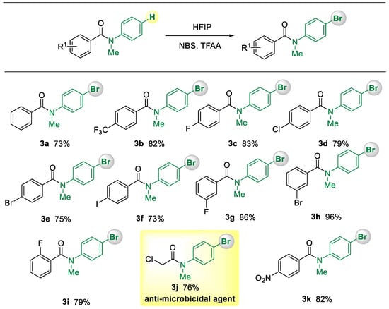 Because of the challenge of selectivity and efficiency, the practical application of regioselective halogenation of C-H activation in a substrate containing two or more arenes is still uncommon [20,21]. Over the past decade, direct functionalization of C(sp2)-H bonds has emerged as a powerful tool for generating new CAr-halogen bonds [22,23,24,25,26]. Among these, direct C-H cleavage, transition-metal-catalyzed functionalization of anilids [27,28,29,30], and hexafluoroisopropanol [31,32,33,34] (HFIP) promoted C-H activation of anilines are the most similar. Although these impressive approaches can be employed to construct halogenated anilids, to the best of our knowledge, directed C-H halogenation in terms of regioselectivity has not been previously described. For instance, knowledge about regioselective C(sp2)-H bromination of N-methyl-benzanilides and its corresponding application in synthesis of biologically important chemicals is still surprisingly underdeveloped. Stimulated by the previous diversification of bioactive agents by a controlled catalyst or photo-induced construction of C-halogen bonds reported by Yu [35,36,37] and MacMillan [38,39,40,41], we envisioned that the regioselective C-H functionalization of benzanilides could be achieved via utility of different catalysts (Scheme 1b). Herein, we report the use of HFIP and Pd(II) as promoters for regioselective C-H bromination of benzanilides to provide a convenient route for synthesis of diverse brominated benzanilide derivatives. When Pd(II) is employed as promoter, bromination occurs on the ortho position of aniline, while a reversed regioselective product is obtained with an HFIP promoter. Preliminary studies of regioselective bromination on other acylanilide substrates are also described.