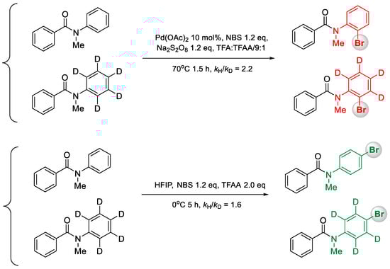 Further studies were performed to gain insight into the mechanisms, which are shown in Scheme 3. A consistent and significant kinetic isotopic effect value of 2.2 was observed with Pd(II) as a catalyst, indicating that C–H cleavage might be involved in the rate-limiting step of the ortho-bromination reaction. In parallel, with HFIP as the promoter, a KIE value of 1.6 was obtained, suggesting that the C–H activation step in para-bromination was partially turnover limiting. Taken together, during the whole transformation, other elementary steps (such as the ligand exchange step) either before or after C–H activation were also critical to the catalytic turnover rate.