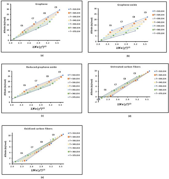 Variations in as a function of of n-alkanes (from n-hexane (C6) to n-nonane (C9)) adsorbed on the different solid materials at different temperatures: (a) graphene, (b) graphene oxide, (c) reduced graphene oxide, (d) untreated carbon fibers, and (e) oxidized carbon fibers.