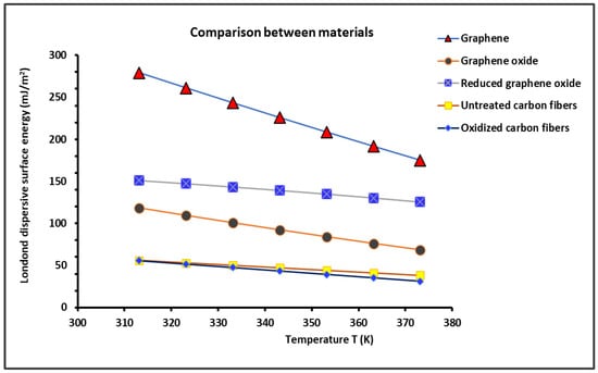 Figure 2 shows that the graphene exhibited the highest for all temperatures followed by the reduced graphene oxide, while the lowest was obtained in the case of the oxidized carbon fibers. The results showed a slight variation in between the untreated and oxidized carbon fibers. However, the oxidation of graphene considerably reduced the value of (about 50%) at 40 °C. This highlights the strong effect of the chemical structure on the value of the London dispersive surface energy of materials. Table 1 shows the differences between the various materials in the values of the London dispersive surface entropy , the extrapolated London dispersive surface energy at 0 K , and the temperature maximum .