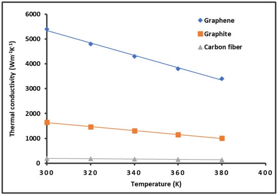 On the other hand, the previous results shown in Figure 2 and Table 1 can be correlated to the thermal conductivity of graphene and carbon materials. Figure 3 gives the variations in the thermal conductivity as a function of the temperature by using data in the literature [6,9,10,11,12,78,79,80,81,82,83,84]. In the studied temperature interval of [300 K; 400 K], it was observed that the thermal conductivity decreased when the temperature increased for the graphene, graphite, and carbon fibers. The results in Figure 3 highlight the highest thermal conductivity of graphene, which also exhibited the highest London dispersive surface energy.