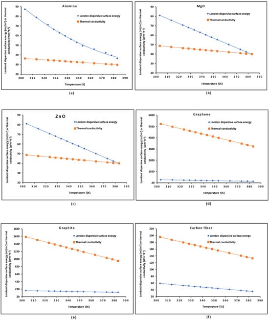 The variations in the London dispersive surface energy and the thermal conductivity of some solid materials such as alumina, MgO, ZnO, graphene, graphite, and carbon fibers as a function of the temperature are plotted in Figure 4.