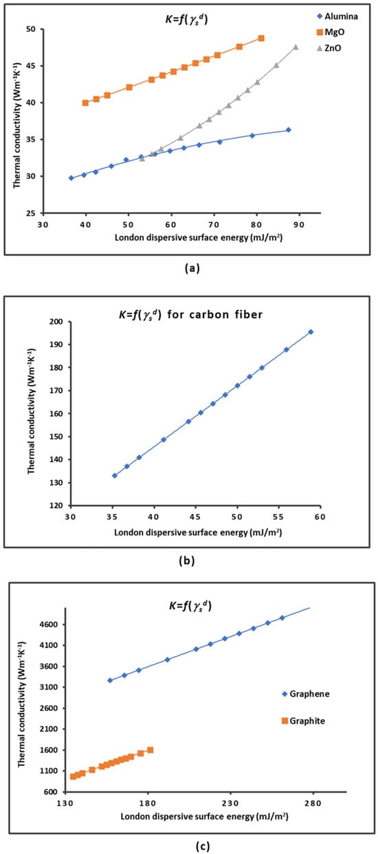 Variations in the thermal conductivity of alumina, MgO, and ZnO (a), carbon fibers (b), and graphene and graphite (c) as a function of the London dispersive surface energy .
