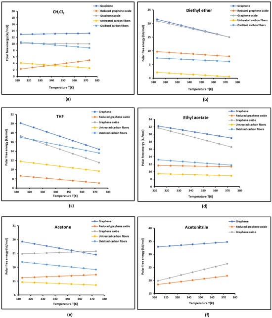 Variations in the polar free interaction energy of the various polar solvents adsorbed on the different graphene and carbon materials as a function of the temperature: (a) dichloromethane, (b) diethyl ether, (c) THF, (d) ethyl acetate, (e) acetone, and (f) acetonitrile.