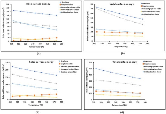 The variations in the polar acid-base energies , , and and the total surface energy of the different graphenes and carbon materials as a function of the temperature are plotted in Figure 7. It can be easily observed that graphene exhibited the highest values for the different components of the surface energy, whereas reduced graphene oxide and oxidized carbon fibers exhibited close polar basic surface energy values, while the lowest basic surface energy was obtained with graphene oxide and untreated carbon fibers. The results of the acidic surface energy showed the highest value for graphene followed by reduced graphene oxide, whereas the lowest values were observed for the oxidized carbon fibers, graphene oxide, and untreated carbon fibers. The same conclusions were observed in Figure 7 for the polar and total surface energy of materials.
