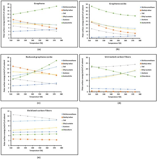 Variations in polar surface energy () of different organic solvents adsorbed on graphene (a), graphene oxide (b), reduced graphene oxide (c), untreated carbon fibers (d), and oxidized carbon fibers (e) as a function of temperature.