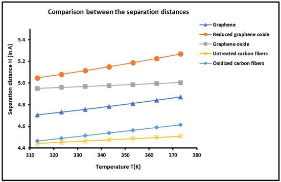 The thermal effect on the distance , shown in Figure 9, led to classifying the graphenes and carbon fibers in decreasing order of :