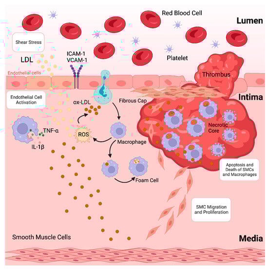 Atherosclerosis, characterised by the accumulation of plaques inside the arterial wall and accompanied by dysregulated lipid metabolism, is among the leading causes of morbidity and death globally [1]. The development of atherosclerotic plaques, which causes blood arteries to narrow and impede blood flow, is often the underlying cause of coronary artery disease (CAD) [2,3]. Atherosclerosis is a chronic inflammatory disease caused by the accumulation of lipoproteins, containing plasma apolipoprotein B (apoB) in specific regions of the arterial tree [4]. These lipoproteins contain cholesterol and oxidised phospholipids that activate endothelial cells (ECs), which then draw monocytes into the subendothelial space [5,6]. Monocytes in the arterial intima undergo differentiation into macrophages that promote inflammation, which in turn intensifies the inflammatory response locally [7]. Furthermore, lipoproteins in the intima are consumed by macrophages, resulting in lipid-laden foam cells that initiate atherosclerotic lesions. Increased macrophage apoptosis and ineffective apoptotic cell clearance are signs of an advanced stage of atherosclerotic lesions that develop if the proinflammatory state continues (as depicted in Figure 1) [8,9,10]. This deadly mixture encourages plaque necrosis, a crucial characteristic of vulnerab8-le plaques that can result in occlusive luminal thrombosis and its aftereffects, which include myocardial infarction (MI), stroke, and abrupt cardiac death [11,12].