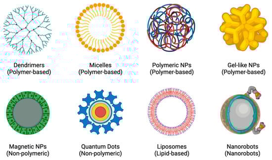 In order to create more individualised and personalised therapeutic procedures, nanotheranostics (a concept that combines both therapy and diagnostics) was created [19]. The rationale is based on the principle that diseases, such as CADs and cancers, are highly diverse and heterogeneous and that the majority of patients only respond well to current treatments when their conditions are in specific stages of progression. Developing a close link between diagnosis and treatment would lead to more individualised treatment plans for patients, which would greatly improve their chances of recovery [19,20]. The potential for molecular imaging and targeted therapy has increased with the rapid development of nanotheranostics and the availability of a wide range of novel agents, including polymer conjugations, dendrimers, micelles, liposomes, nanoemulsions, self-nanoemulsifying drug delivery systems (DDS), and metal and inorganic NPs [19,21], as shown in Figure 2. Because of their long circulating half-lives, binding selectivity, low toxicity profiles, ease of manufacturing, and potential for delivering complementary therapies, NPs are excellent tools for enhancing theranostic approaches to treating diseases [22,23].