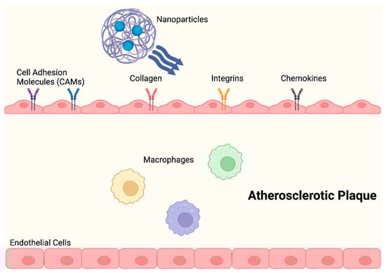 A wealth of research has demonstrated that NPs significantly enhance the chemical stability and pharmacokinetic profile of loaded therapeutics, including small-molecule pharmaceuticals, peptides, proteins, small interfering RNA (siRNA), and microRNA (miRNA). NPs are hence particularly useful tools in anti-inflammatory therapies in the treatment of CADs. By lowering off-target and systemic side effects in comparison to free drugs alone, nanotherapeutics may also help drugs overcome major translational obstacles [16,24]. The delivery of therapeutics and imaging agents to inflammatory macrophages in atherosclerotic plaques has been improved with the use of targeted NPs (Figure 3). Moreover, in mouse models, NP-mediated drug delivery strategies have demonstrated great promise in suppressing certain pathological processes, such as inflammation, that are linked to the advancement of atherosclerosis with a high degree of specificity [16].