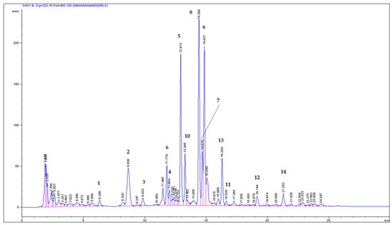 HPLC chromatogram (analyzed at 320 nm) of coumarin compounds in ASE Mex/130 from A. majus fruits; 1: umbelliferon; 5: xanthotoxin; 8: isopimpinellin; 9: bergapten; and 12: imperatorin. Coumarins with umbelliferon-like spectra, 2, 3, 4; with xanthotoxin-like spectra, 6, 7; with bergapten-like spectra, 10, 11; and with imperatorin-like spectra, 13, 14.