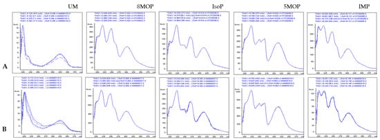 HPLC/DAD UV spectra of the standards and coumarins detected in the Mex/130 extract; (A) DAD/UV spectra of reference standards; (B) DAD/UV spectra of detected compounds; UM: umbelliferon; 8 MOP: xanthotoxin; IsoP: isopimpinellin; 5 MOP: bergapten; and IMP: imperatorin.