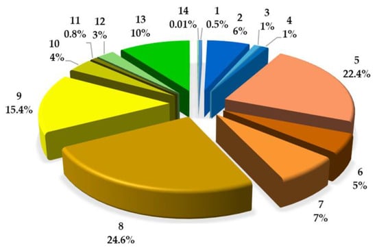 Quantitative estimation of the coumarin composition in the methanol ASE/Mex/130 extract from A. majus fruits. Coumarin compounds; 1: umbelliferon; 5: xanthotoxin; 8: isopimpinellin; 9: bergapten; and 12: imperatorin. Coumarins with umbelliferon-like spectra, 2, 3, 4; with xanthotoxin-like spectra, 6, 7; with bergapten-like spectra, 10, 11; and with imperatorin-like spectra, 13, 14.