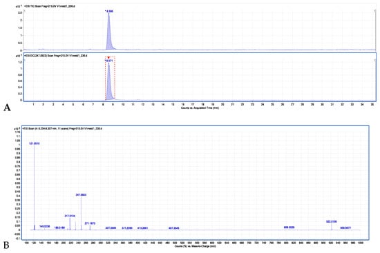 Figure 5A presents the total ion chromatogram (TIC) and the extracted ion chromatogram (EIC). The MS spectrum of the isolated isopimpinellin is shown in Figure 5B.