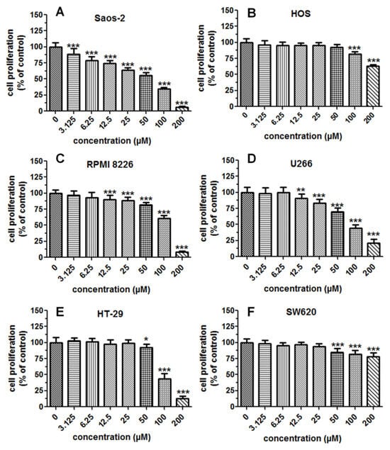 Impact of IsoP treatment on proliferation/viability of selected cancer cell models. Saos-2 (A), HOS (B), RPMI8226 (C), U266 (D), HT29 (E), and SW620 (F). The cells were cultured alone or in the presence of different concentrations of the compound, and the antiproliferative activity of IsoP was determined by the MTT assay at 96 h. Each bar represents the mean ± standard deviation (SD) of three independent experiments. * p < 0.05, ** p < 0.01, and *** p < 0.001 in comparison to the control (DMSO), one-way ANOVA test.