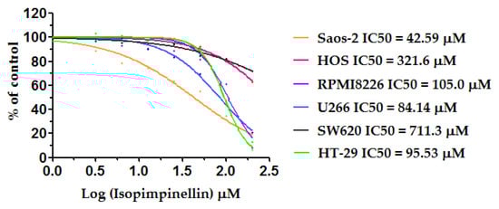 Non-linear curve fitting for the dose response curve of isopimpinellin in the Saos-2, HOS, RPMI8226, U266, SW620, and HT-29 cell lines, and their corresponding IC50 values (µM).