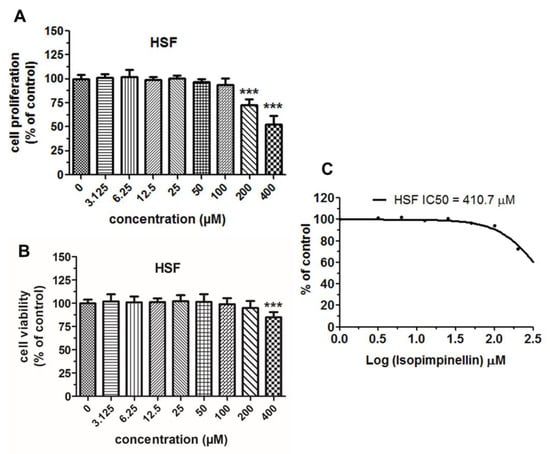 Cytostatic and cytotoxic activity of isopimpinellin (IsoP) against normal HSF cells. The cells were incubated with various concentrations of IsoP for 96 h (A) or 48 h (B) to evaluate their proliferation rate (by the MTT assay) and cell viability (by the NR assay), respectively. A nonlinear regression analysis of the average proliferation values of IsoP against HSF was used for the IC50 calculation (C). Each bar represents the mean ± standard deviation (SD) of three independent experiments; *** p < 0.001 in comparison to the control (DMSO), one-way ANOVA test.